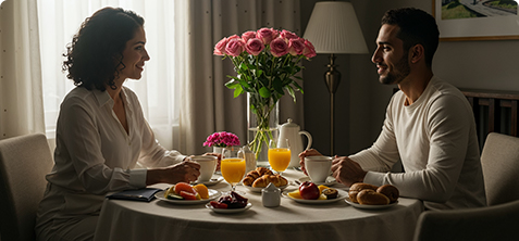 Celebre o amor com um delicioso café da manhã especial, servido com itens selecionados, decoração temática e clima romântico. Inclui diária com hospedagem para o casal e mimo surpresa no quarto.