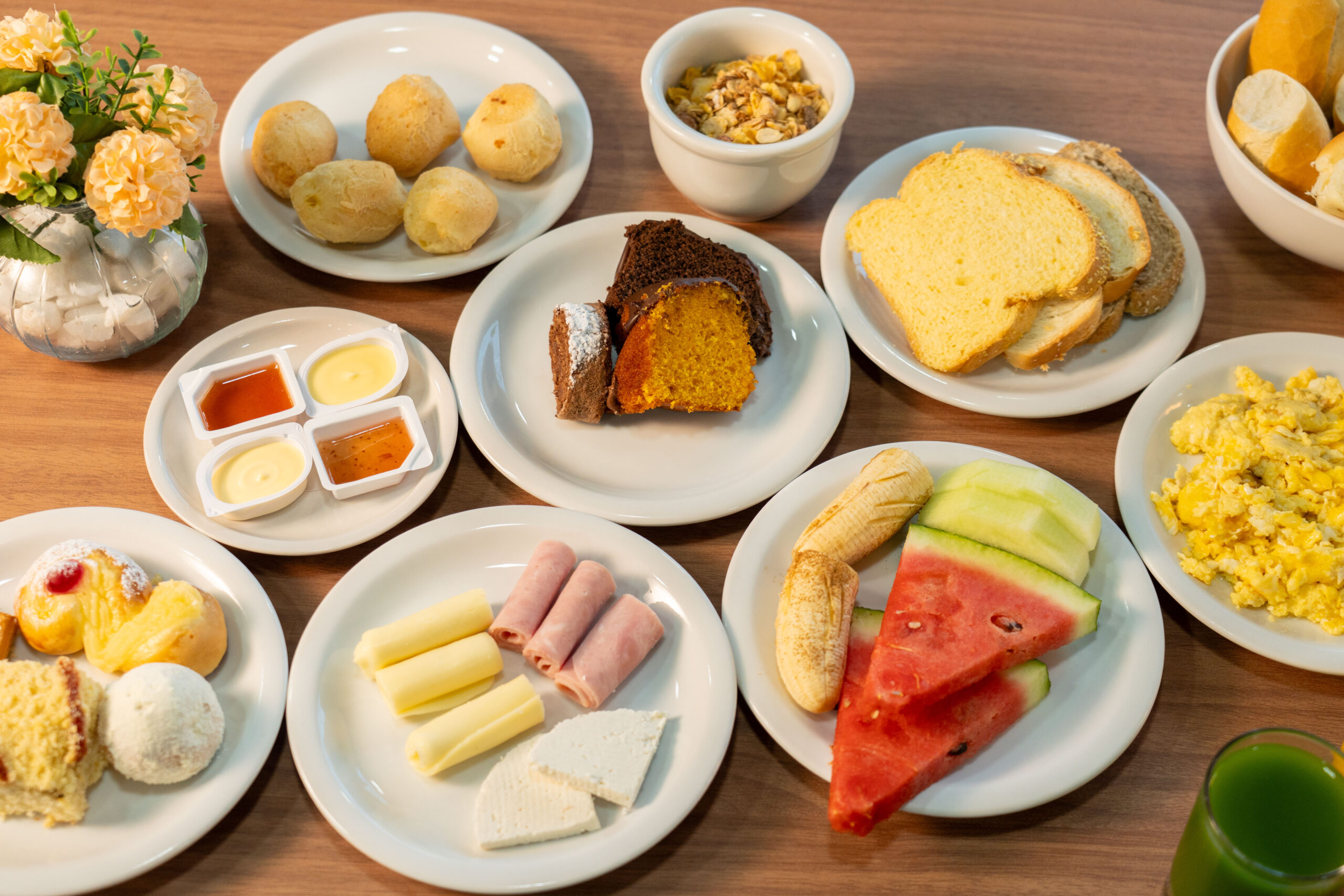 Nosso café da manhã é um dos destaques da casa uma refeição completa e preparada com carinho na nossa própria padaria, com frutas frescas, sucos naturais, pães e bolos feitos diariamente.